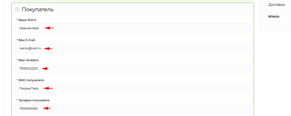 Заполните обязательные поля заказа: Ваши ФИО, e-mail, телефон, ФИО получателя заказа и телефон получателя.
