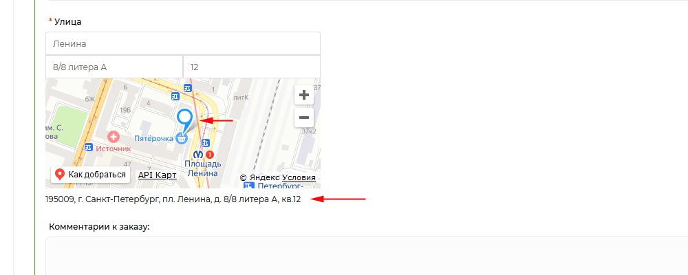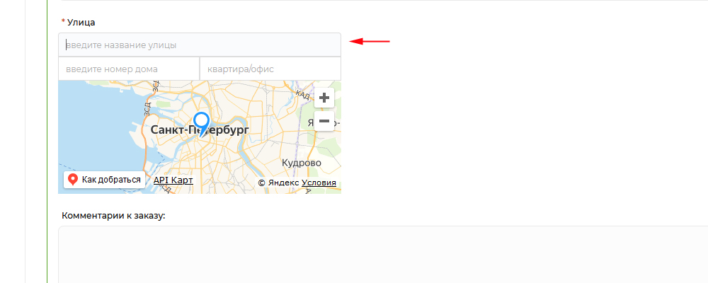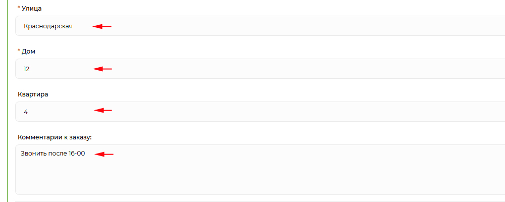 Если доставка адресная (курьером до квартиры), заполните обязательные поля адреса доставки: улица, дом, квартира. В случае доступности сервиса КЛАДР Вы увидите форму с подсказками.