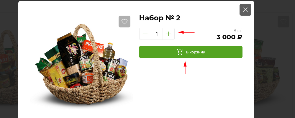 Вы можете открыть карточку товара и добавить его в корзину из нее, указав необходимое количество товара.