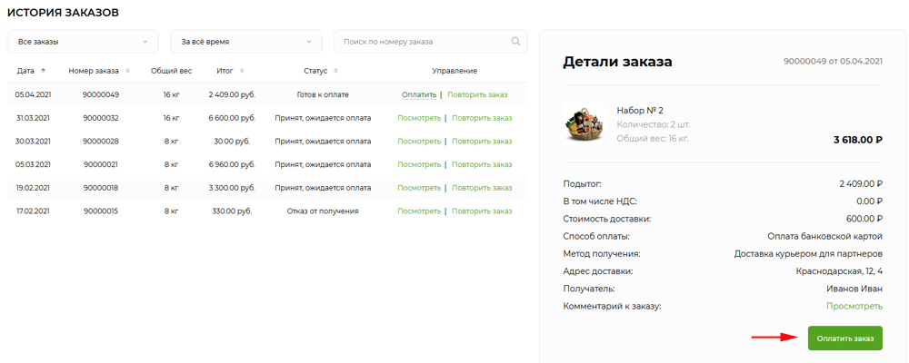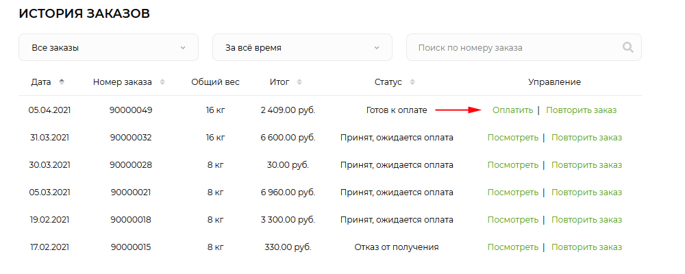 Найдите в списке нужный заказ со статусом "Готов к оплате" и нажмите на кнопку "Оплатить".