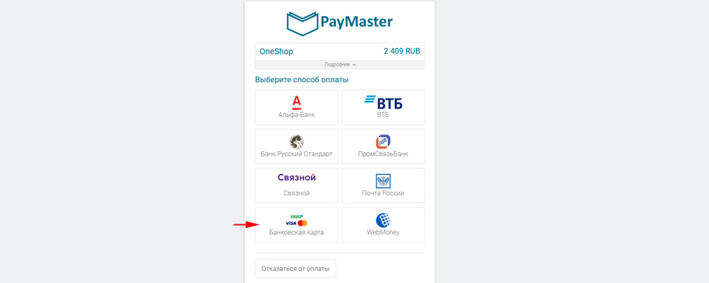После нажатия кнопки "Оплатить" выберите удобный для Вас способ оплаты и следуйте инструкциям платежной системы Paymaster.