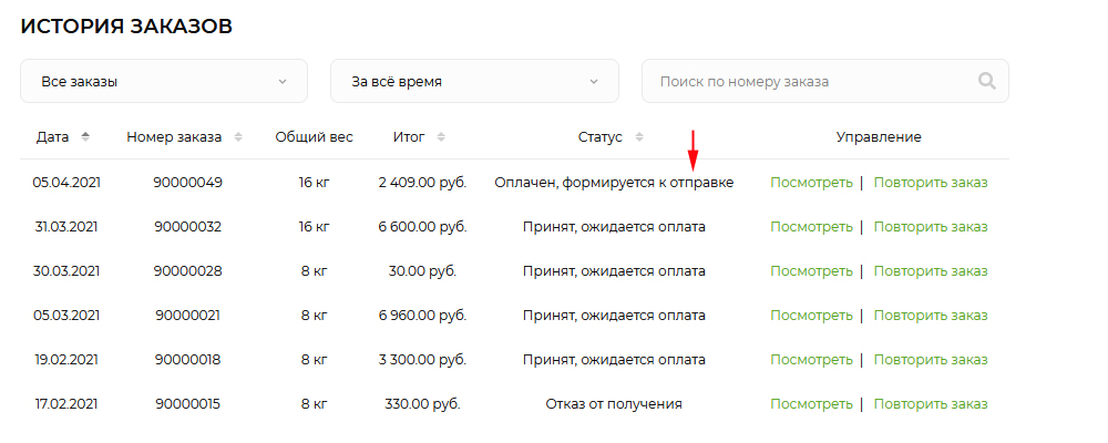 После успешной оплаты Вы вернетесь на сайт и можете увидеть фиксацию оплаты на странице истории заказов.