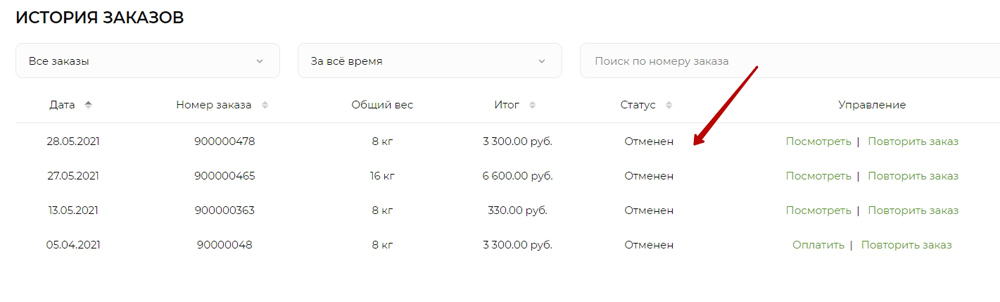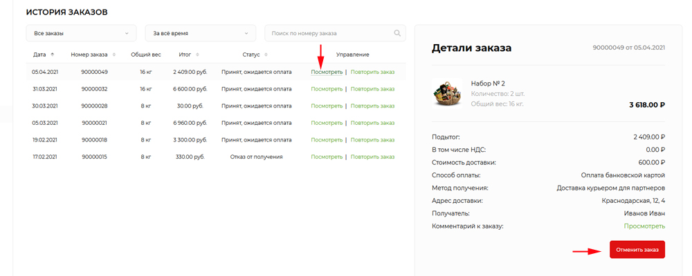 Если необходимо отменить заказ, Вы можете сделать это на странице истории заказов. Для этого нажмите на кнопку "Посмотреть" у заказа.