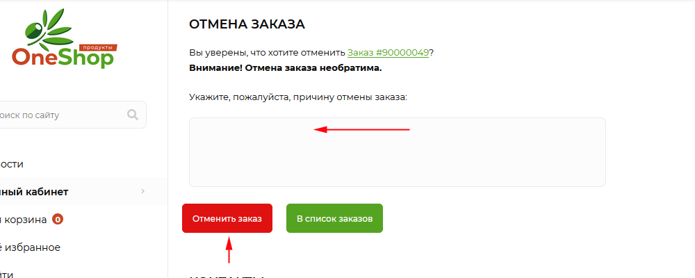 Пожалуйста, укажите причину отмены и нажмите кнопку "Отменить заказ".