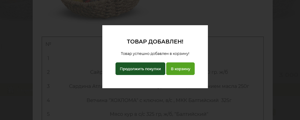 После этого Вы увидите сообщение об успешном добавлении товара в корзину. Вы можете продолжить покупки или перейти в корзину для оформления заказа.