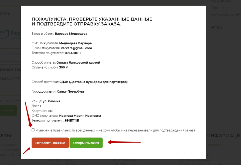 Если данные не верны, воспользуйтесь кнопкой “Исправить данные”. После корректировки выберите один из способов оформления заказа, описанных выше.