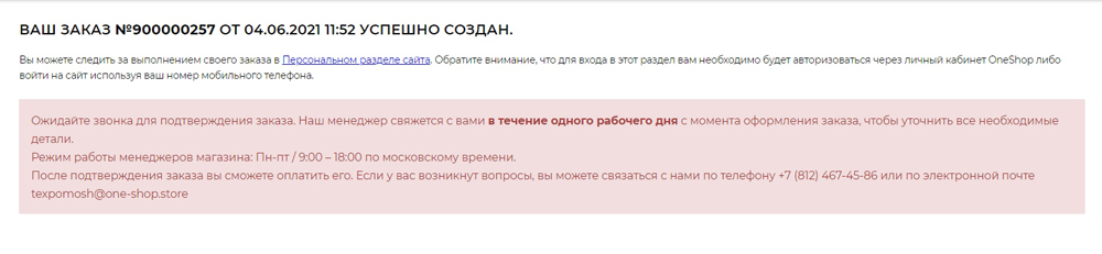 Если данные верны, но у Вас остались вопросы по заказу, оставьте галочку не активной и нажмите кнопку Оформить заказ. Далее Вы перейдете на страницу с указанием номера заказа (в случае самостоятельного обращения в магазин указывайте этот номер) и информацией о сроках обработки заказов. В этом случае провести оплату сразу нельзя, Вы ожидаете звонка от менеджера и только после этого заказу будет присвоен статус Готов к оплате.
