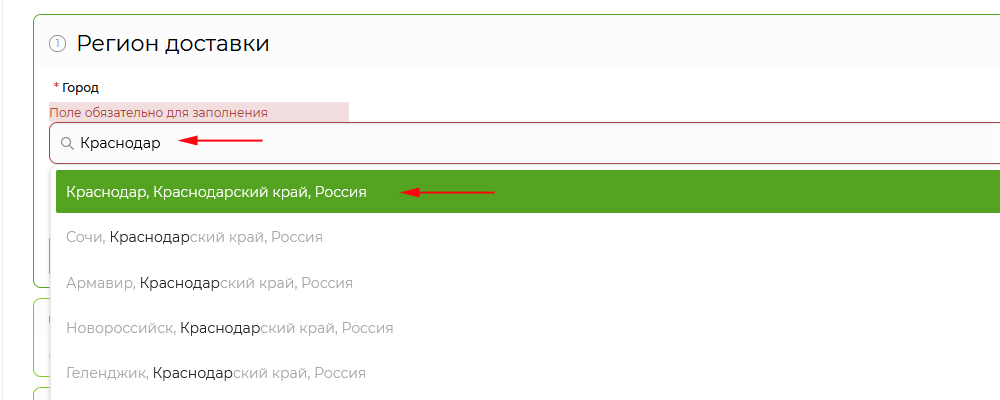 Для начала оформления заказа начните вводить название своего города. Выберите нужный город из выпадающего списка, который покажет вам сайт.